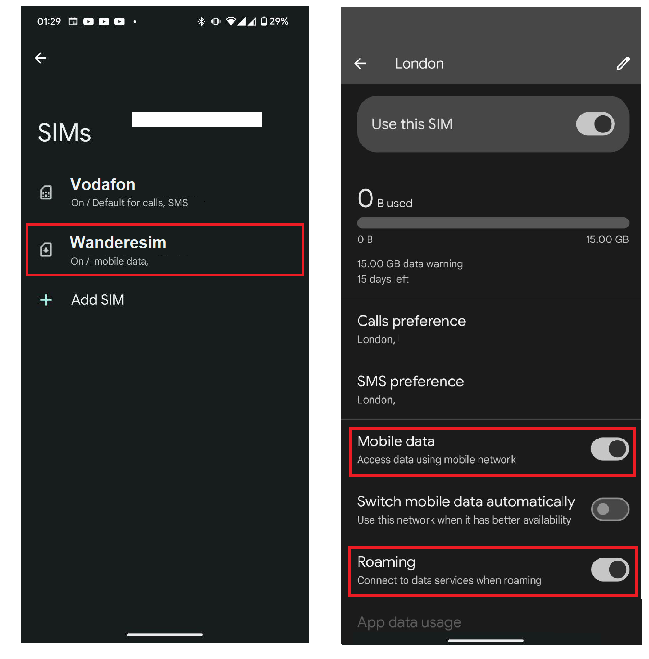 Step 18: Swipe down and Turn ON the toggle buttons for "Mobile Data" and "Roaming".