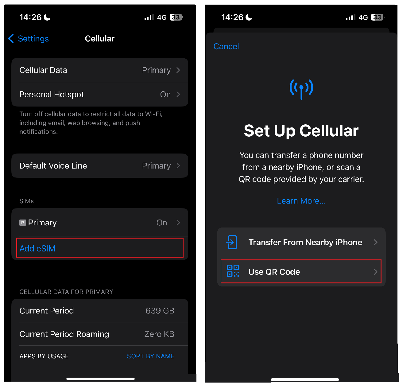 There are two ways to install an eSIM on your device: using the QR Code method and the Manual method. Below are the step-by-step instructions for each method.