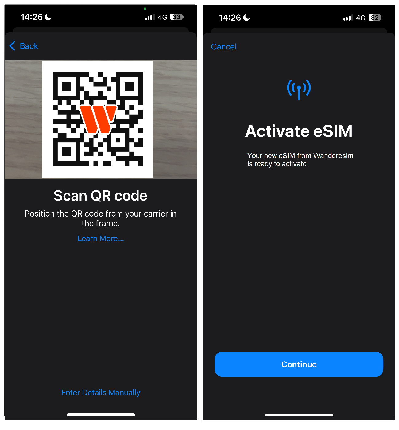 - Confirmation Code(if available on your Wanderesim Account). If prompted, enter the 4-digit confirmation code. Skip this step if you are not provided with a confirmation code.