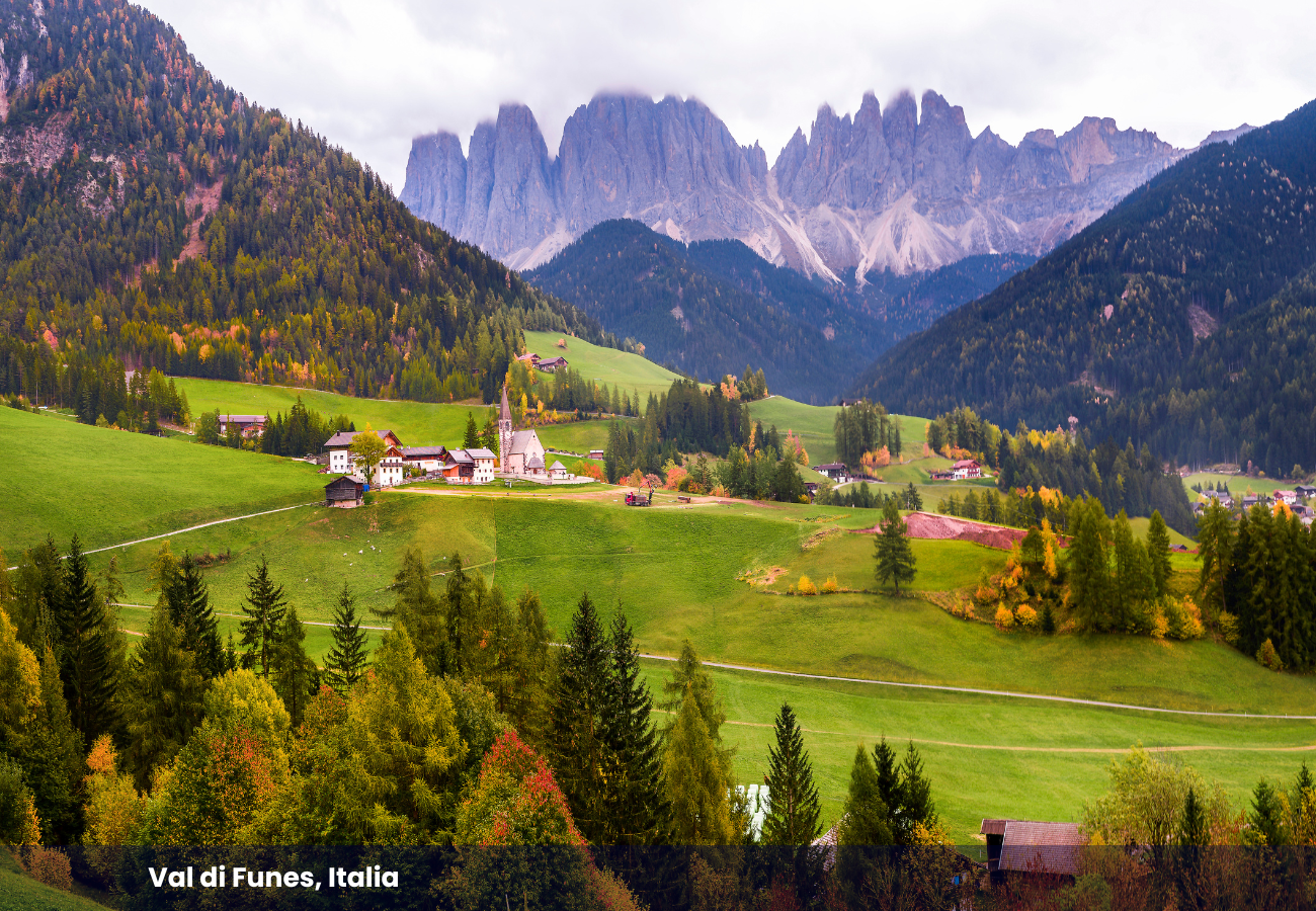 Escondido en los Dolomitas italianos, Val di Funes es un paraíso oculto que en otoño se llena de color. Colinas verdes contrastan con picos nevados, mientras que las hojas doradas y la icónica iglesia de Santa Magdalena crean una escena digna de postal.